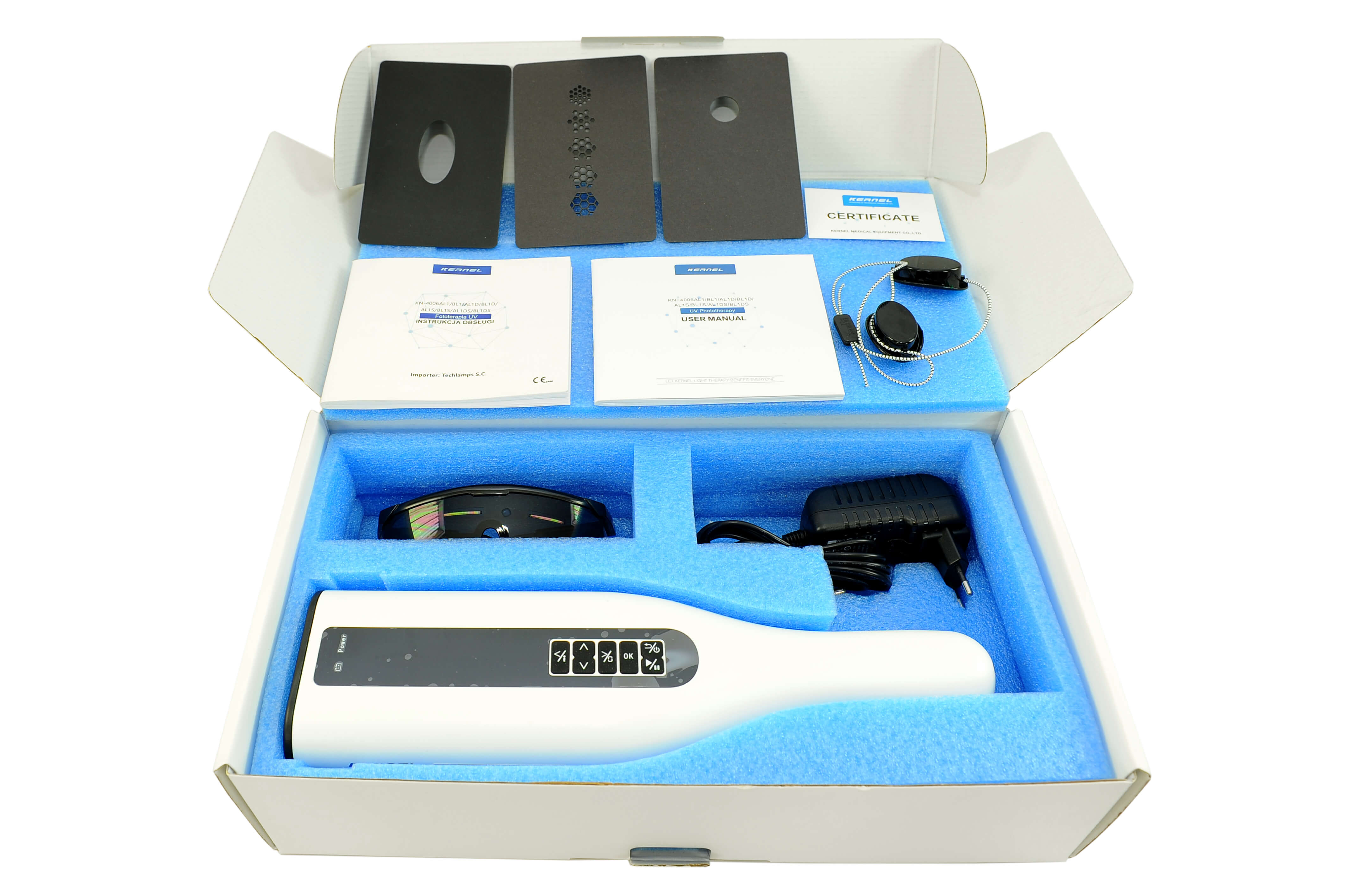 - Grzebień do utrzymania odpowiedniej odległości od skóry głowy. Grzebień można zdemontować, aby naświetlać punktowe zmiany na ciele.