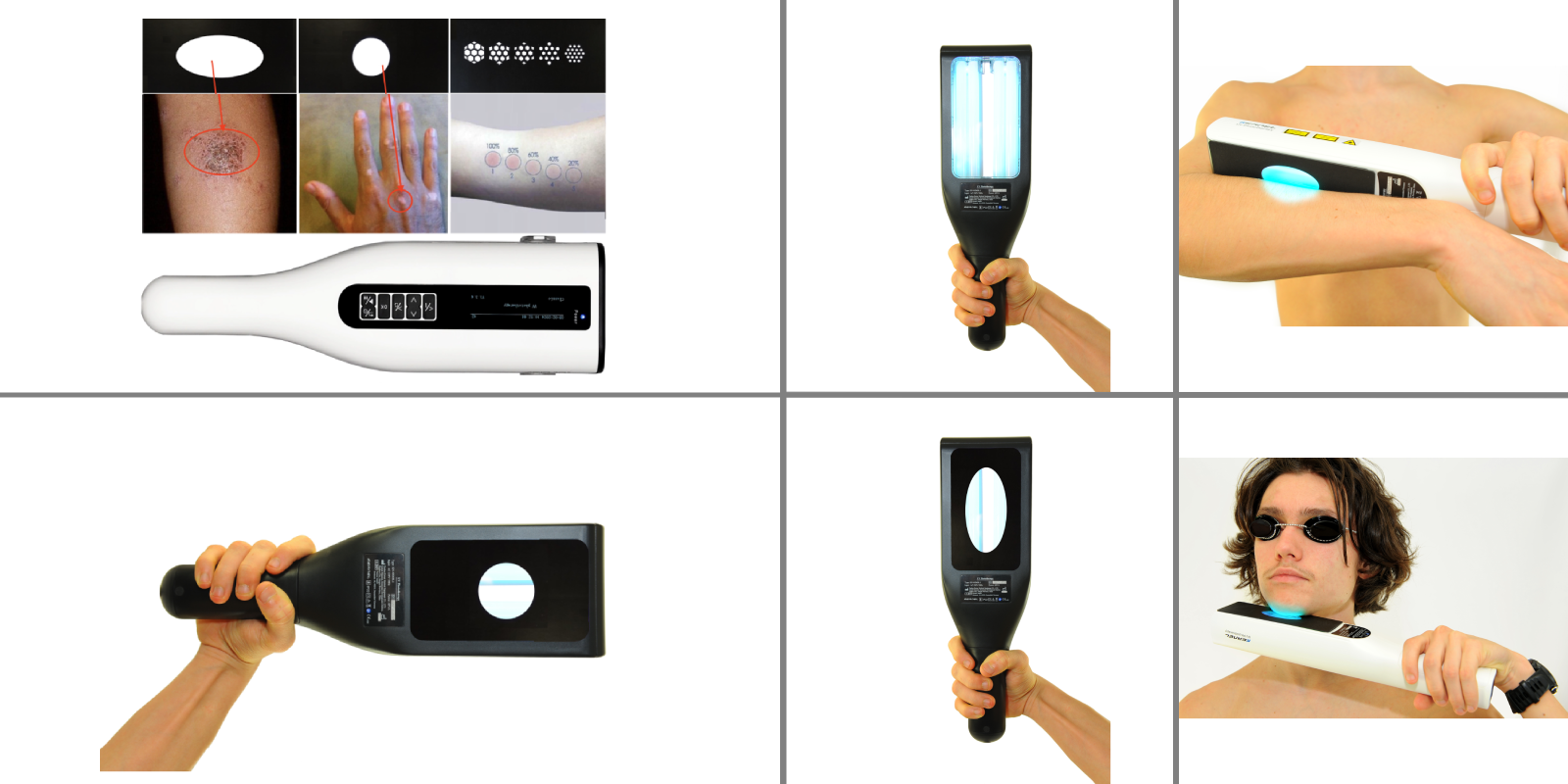 - Tester MED do bezpiecznego ustalenia minimalnej dawki strumienia UVB - zawiera pasek z 5 różnymi polami testującymi. Różnica wykazanego dawkowania w polach testowych jest wynikiem różnego wyjścia, a zatem zróżnicowanego promieniowania UVB ( w instrukcji obsługi znajduje się opis stosowania testera) Przed rozpoczęciem terapii łatwo można określić testerem MED początkowy czas naświetleń dla danej powierzchni ciała!